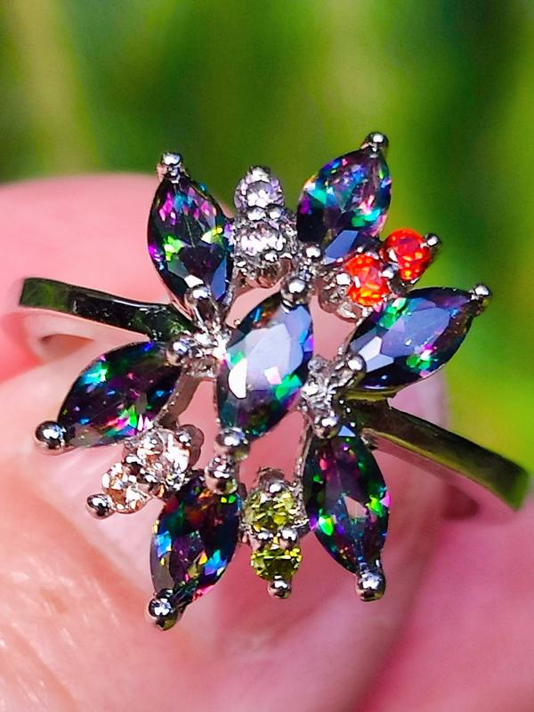 Нежное кольцо в виде снежинки с основными ручками, а также с закрепленными другими маленькими камешками: перодот,гранат..,размер 18.5,19, под кольцо тогоже мастера серьги с пробой 925 (гвоздики), многие браслеты, тонкие и толстые по разной цене.