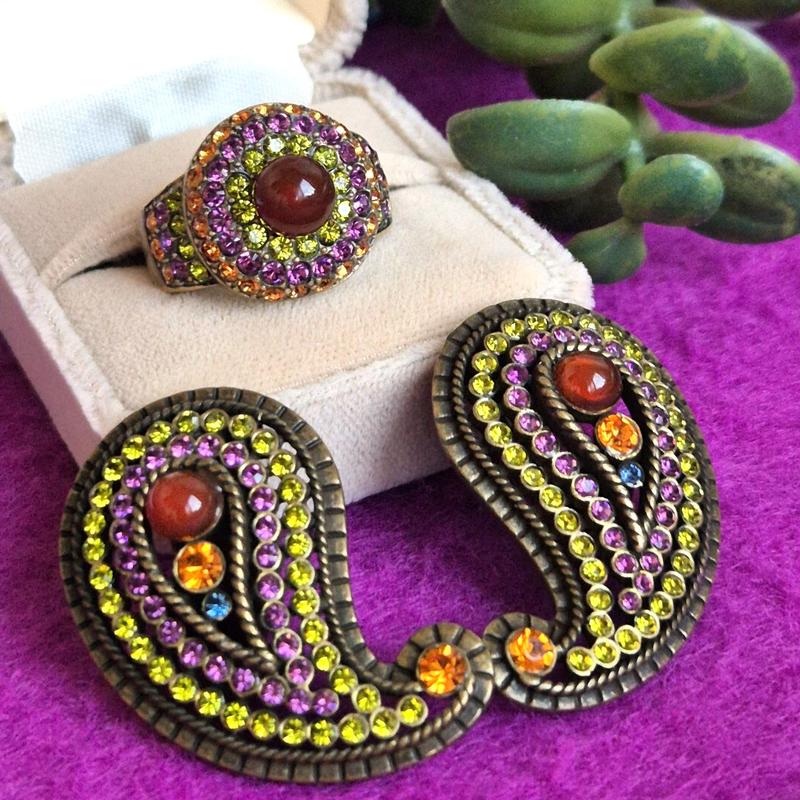 Неймовірної краси каблучка від відомої дизайнерки з США Хейді Даус. Це - майстр кольорів та кристалів. Її творіння - яскраві прикраси з узнаваним стилем для сміливих красунь. Коли бачиш творіння Хейді, починаєш розуміти фразу "свято, яке завжди з тобою"... Прикраса у салатових, лилових та помаранчевих барвах. Блискучі кристали, етнічні форми. На каблучці є не значні потертя (на фото). Розмір каблучки - 19.