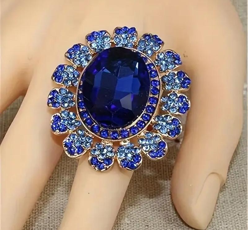 Каблучка велика золотистого кольору з синіми камінцями, розмір регулюється