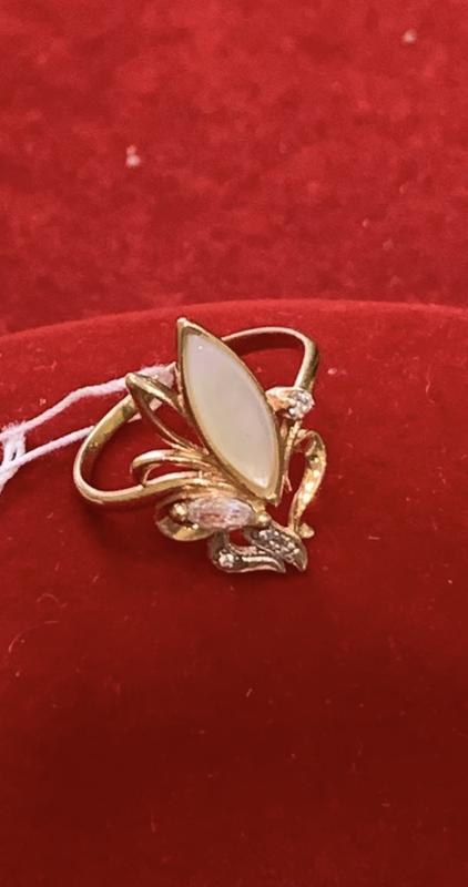 Золота каблучка 585 проби із вставкою натурального перламутру та білих фіанітів, вага виробу 2,62 грами, розмір 17,5.