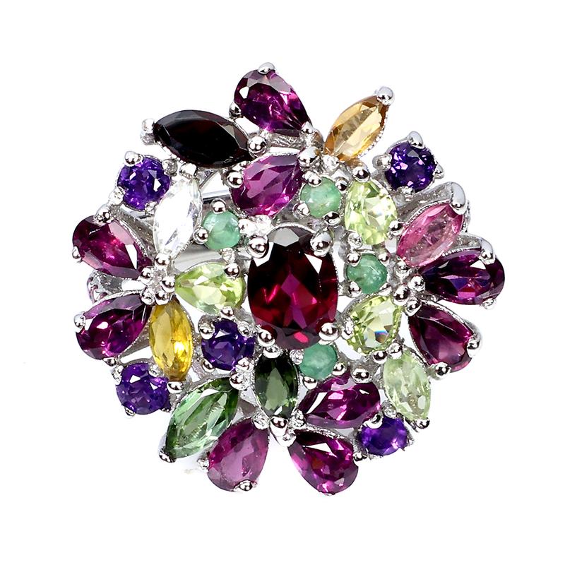 К5363 Natural Rhodolite Garnet, Amethyst, Emerald, Peridot, Tourmaline 25.0 X 20.0 MM. Размер 19. Вага 7.56 гр. Серебро 925 пробы покрыто белым золотом. Размер камней - 1.0 TO 7.0 X 5.0 MM. Чистота - If To Vvs. Обработка - Unheated. Происхождение - Africa.