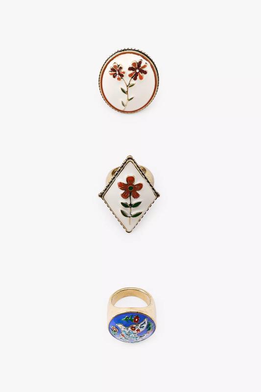 Набор из трех металлических колец различных геометрических форм. Объемные детали в виде цветов и птички из цветной смолы. Размер S = 16,5 мм. Размер M = 17,5 мм.