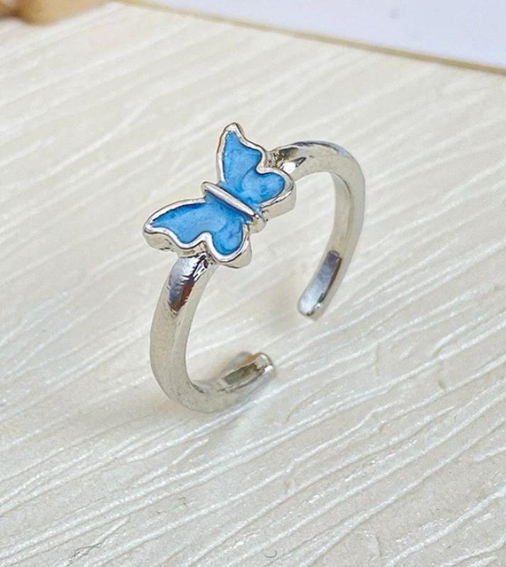 Универсальный размер, кольца не замкнутая Матералл - серебристый сплав, бабочка покрыта голубой эмлью
