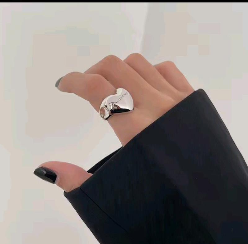 Это массивное серебристое кольцо в форме сердца. Оно имеет гладкую, зеркальную поверхность с небольшой гравировкой, что придает ему нежность и символичность. Дизайн выглядит минималистично и в то же время выразительно – украшение, подходит как для повседневного стиля, фотосессий так и для особых случаев.