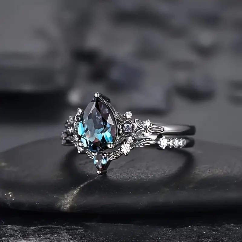 Кольцо из 2-х частей с каплевидным драгоценным камнем Элегантный цветочный дизайн 2-х частей кольцо с каплевидным драгоценным камнем, простые роскошные кольца в стиле для женщин