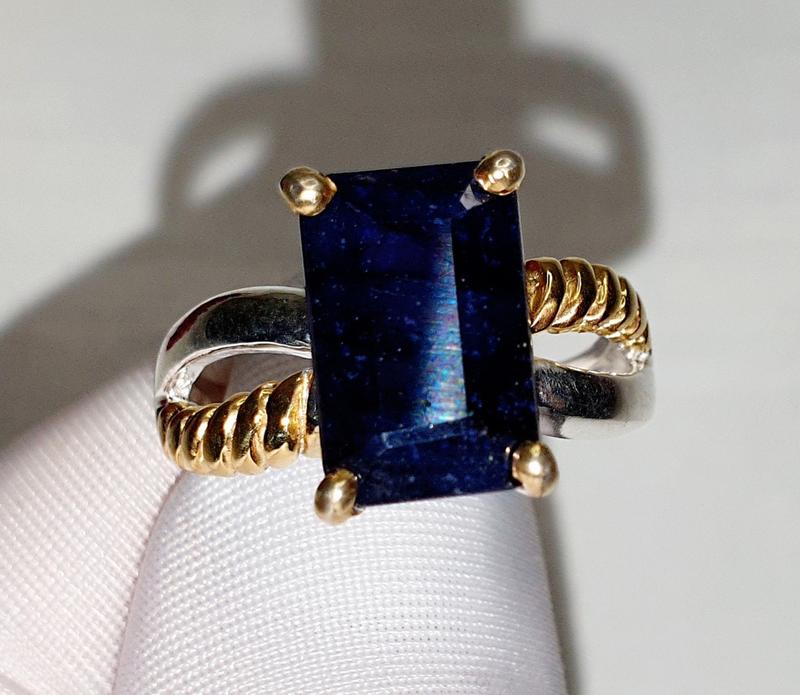 Серебряное Кольцо с натуральным крупным темно-синим Сапфиром Цвет камня темно-синий глубокий, как ночное небо. Серебро 925 пр., покрытие белым и желтым золотом. Вес изделия - 5.7 г. Размер кольца - 19. Размер камня - 12 X 8.0 мм. Происхождение камней - Африка (облагороженый). Изделие изготовлено в Таиланде.
