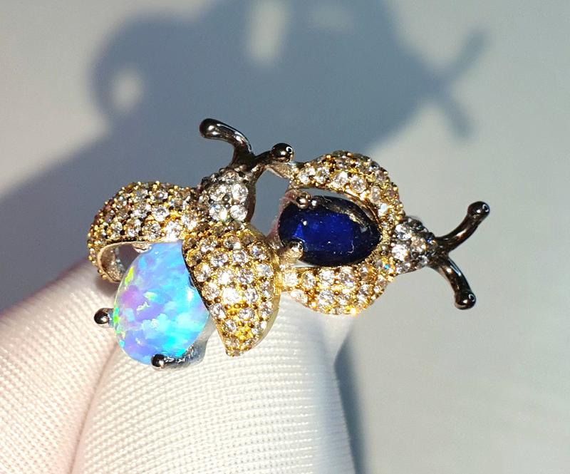 Серебряное кольцо с опалом, сапфиром и фианитами "божьи коровки", размер 18 - 18.25
