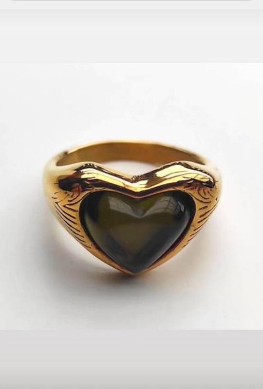 Каблучка, зі вставкою насиченого оливкового кольору у формі серця Бренд Maari studios Позолота 18 К, багатошарове покриття позолотою Цирконій, Благородні метали 316 Розмір 17 -17,5 Нова, у рідному пакуванні