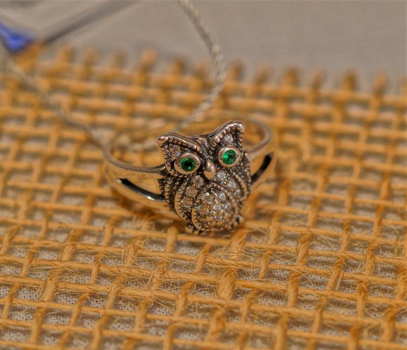 Кольцо серебряное с цирконием "Сова" 925 пробы, Украинского производителя. Аккуратной работы, стильное и хорошего качества изготовления кольцо. Вес 3.09 грм., чернение. Размер кольца 18,0. Изделие опробировано пробирной палатой Украины, стоит клеймо производителя.