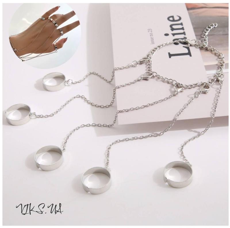 Набор из пяти колец с браслетом на цепочках Особенность данного комплекта заключается в том, что кольца соединены с браслетом цепочками. Цепочки с легкостью можно отстегнуть, изменить порядок, или же расстояние. Материал: бижутерный сплав Размер колец: регулируется Комплект: 5 колец с браслетом на цепочке