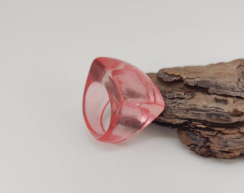 Кольцо из прозрачного акрила (цвет розовый). Размер 17,5, размеры площадки кольца 2,10 см., на 2,50 см., верх кольца выступает над пальцем на 1,00 см., вес 7.65 грм.
