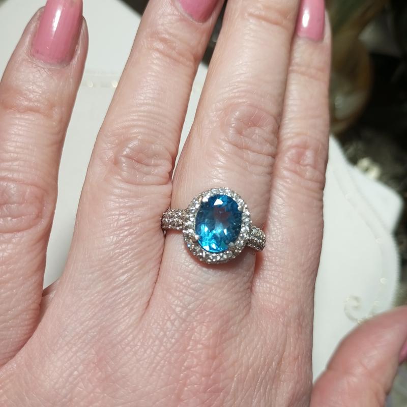 Шикарное серебряное кольцо с большим голубым топазом насыщенного цвета в окружении белых фианитов, размер 17,5. Сделано в Украине по образцу свадебной кольца непревзойденной принцессы Дианы. Проба украинская -тризуб. Топаз огранки овал размером 1,0 см на 0.8 см. Передняя часть 1,4 см на 1,2 см. Передняя часть обода тоже имеет до половины дорожку фианитов в 3 ряда. Все камушки на месте.