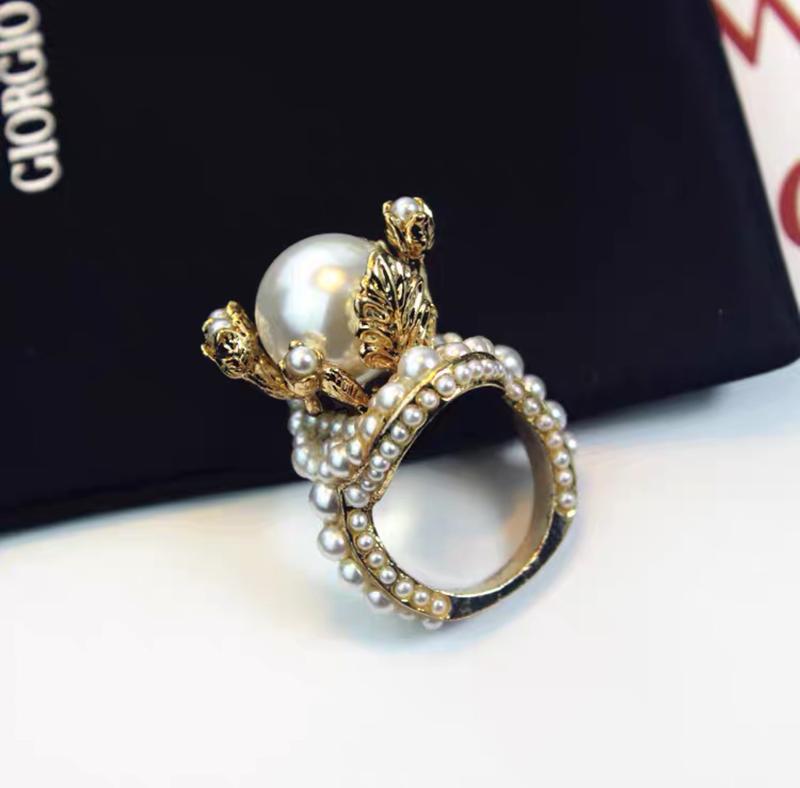Стильное и неповторимое кольцо на размер 17-17.5. Инкрустирование искусственным жемчугом и выполнено из ювелирного сплава который не темнеет.