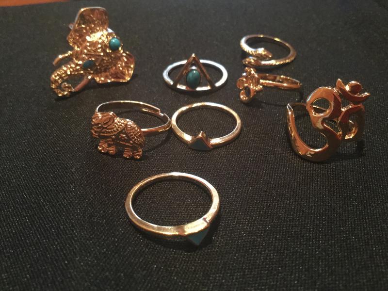 2 кільця регульовані,а інші на різні фаланги пальчиків.