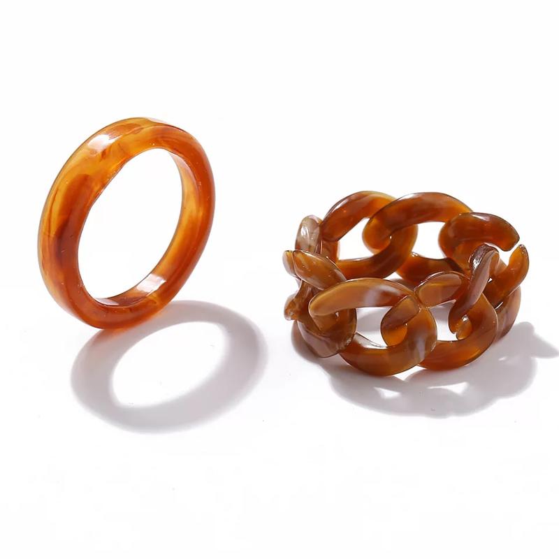 Новинка! Стильные и модные в этом сезоне, акриловые кольца набором. В наборе широкое кольцо в виде массивной цепи 16 размера и тонкое колечко 17 размера. Цвет: коричневый ( есть и другие цвета-наличие уточняйте) Состав: акрил. Размер: 16 и 17.