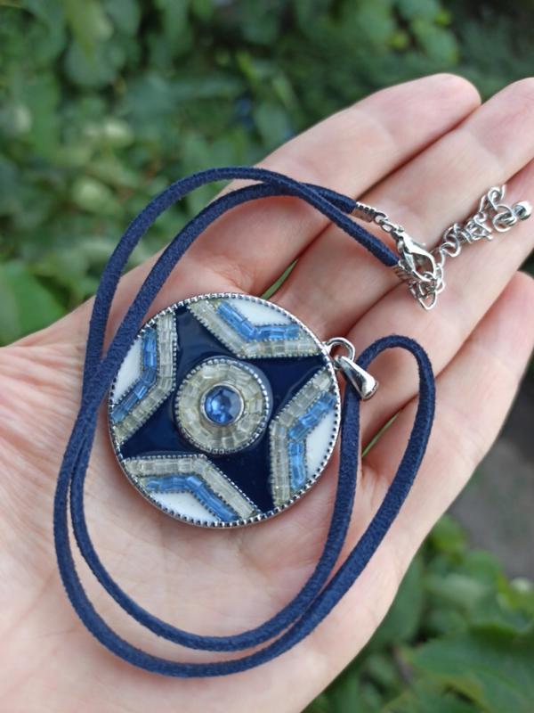 Нове з металу, виглядає як срібло по центру камінці і емаль шнурок ніби замш натуральний, щось мягеньке на дотик. довжина 40 см + 7 додаткові гарне буде на подарунок - надішлю в гарній коробочці)