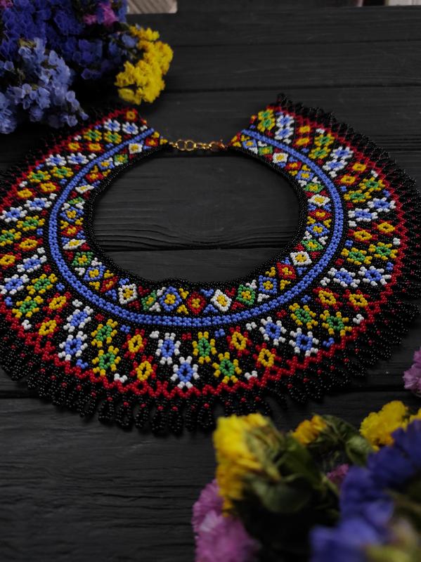 Силка выполнена из чешского бисера с народными мотивами. Дополнена металлической фурнитурой, имеет цепочку чтобы удлинить длину изделия, ширина силянки - 7,5 см. Доставляется в индивидуальной брендированной упаковке.