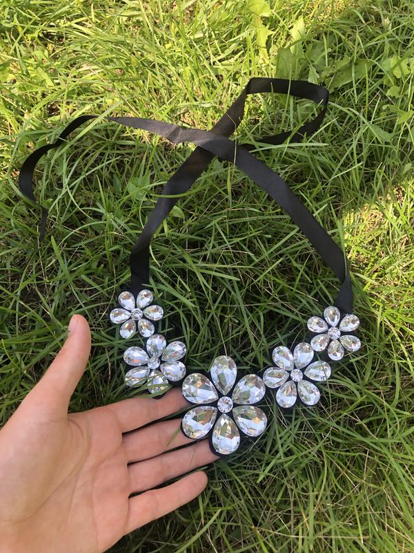 Гарне кольє з масивними стразами ,зробить ефектним навіть самий простий образ Зав‘язується на гарні подібні до шовку стрічки