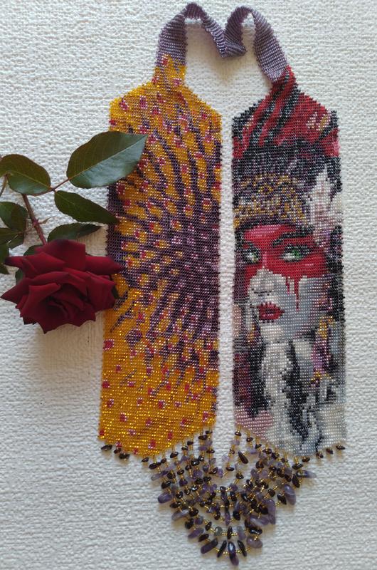 Сотканная из света и тени… Из пламени и льда. Из тончайших оттенков и нюансов Бытия. Познавшая свою Силу и свою слабость. Способная врезаться в память, одним взглядом. И оставить неизгладимый след в жизни у всех, кого коснётся этот взгляд. Женщина- Загадка, которая выше всех правил. Она и есть – правило! Счастливы будут те, с кем она захочет разделить свой жизненный Путь. Потому, что она щедра, как сама природа. И так же безжалостна и справедлива, когда обижают тех, кто ей дорог. Именно, для такой женщины родился гердан «Прикосновение страсти». Яркий, мощный, колдовской… Самый крупный, из ныне созданных. Единственный такой. ПОВТОРА – НЕ БУДЕТ. Разумеется, что такой гердан нужно было украсить гранатом. Магические свойства камня гранат заслуживают отдельного внимания, так как они оказывают непосредственное влияние на энергетику своего обладателя. Эзотерики и маги описывают этот минерал как средство, помогающее человеку получить власть над окружающими людьми. Гранат обладает мощной энергетикой и идеально подходит в качестве амулета активному, страстному, коммуникабельному и работающему с полной отдачей человеку. Своему хозяину он подарит счастье, везение и успех, убережет от неприятностей и поможет найти правильный выход из сложных ситуаций. А вот людям ленивым, нерешительным и безынициативным магия не советует носить изделия с гранатом. Наделенный сильной энергетикой минерал измотает их и приведет к физическому и нервному истощению. Гранат в гердане уравновешен аметистом. Аметист считается подарком Богов. Конечно, самоцвету, который считался подарком Богов, приписывали множество различных возможностей. Основным свойством камня является защита от воздействия алкоголя. Аметист не только уменьшает тягу к спиртному, но и облегчает проявление похмельного синдрома. Однако магические свойства камня намного обширней. Он помогает добиться успеха в бизнесе, спорте и любви. Аметист наделяет энергией своего обладателя. Очищает помыслы, дарует благоразумие и направляет мысли в правильное русло. Аметист может помирить людей, положив конец даже очень длительной вражде и защищает своего хозяина от гнева и злости окружающих. Гердан изготовлен из чешского бисера. Схема – Patrizia Bijoux. В бусах – сколы граната и аметиста.
