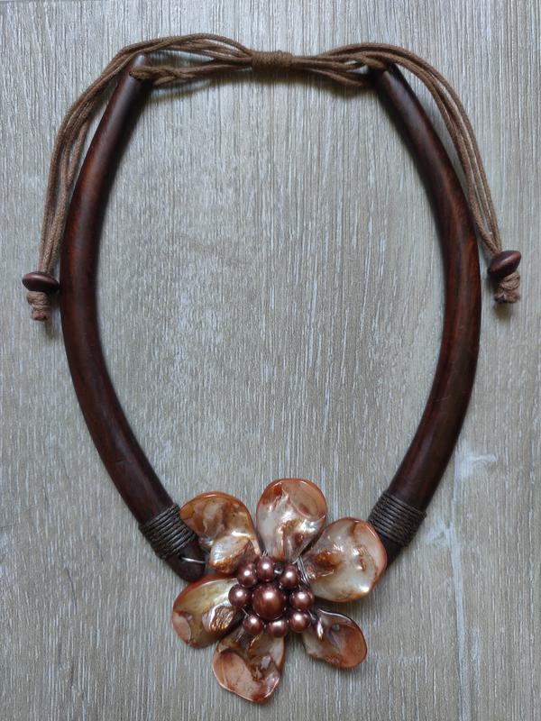Продам оригинальный, броский чокер-колье из натурального полированного дерева и подвески в виде цветка из перламутровых лепестков и стеклянных бусин под жемчуг "Майорка". Длина чокера регулируется кулиской. По всем интересующим вопросам пишите - отвечу.
