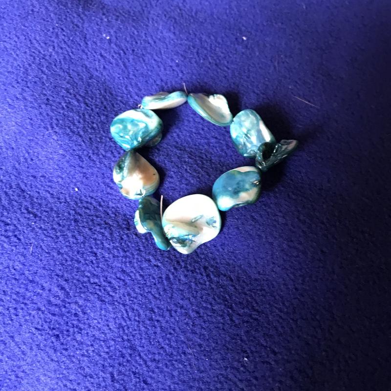 Браслет из перламутра, звенья неправильной формы, подкреплён в бирюзовый цвет, на резинке