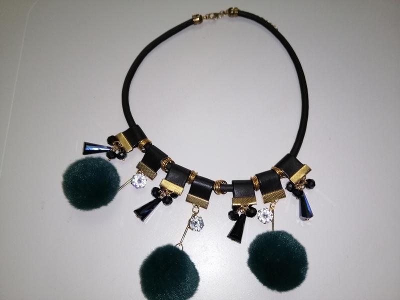 Ожерелье с мягкими бубонами. Европа. ( зеленый). Материал: металл, силиконовый шнурок - ?, бусины, мягкие бубоны.. Дефекты: по фото б\у из одного бубона вытянулась петелька ( но целая).
