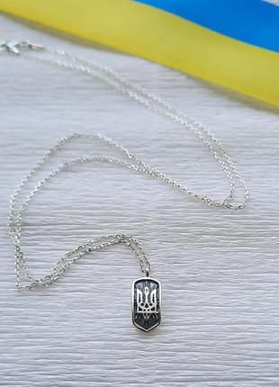 Стильное серебряное колье из патриотической символикой Тризуб Украины. Средний вес колье 2,17 грамм серебра 925 пробы. Вес колье зависит от длины и может отличаться в одну или другую сторону. Размер кулона 14х6 мм. Длина - 40;45;50 см.