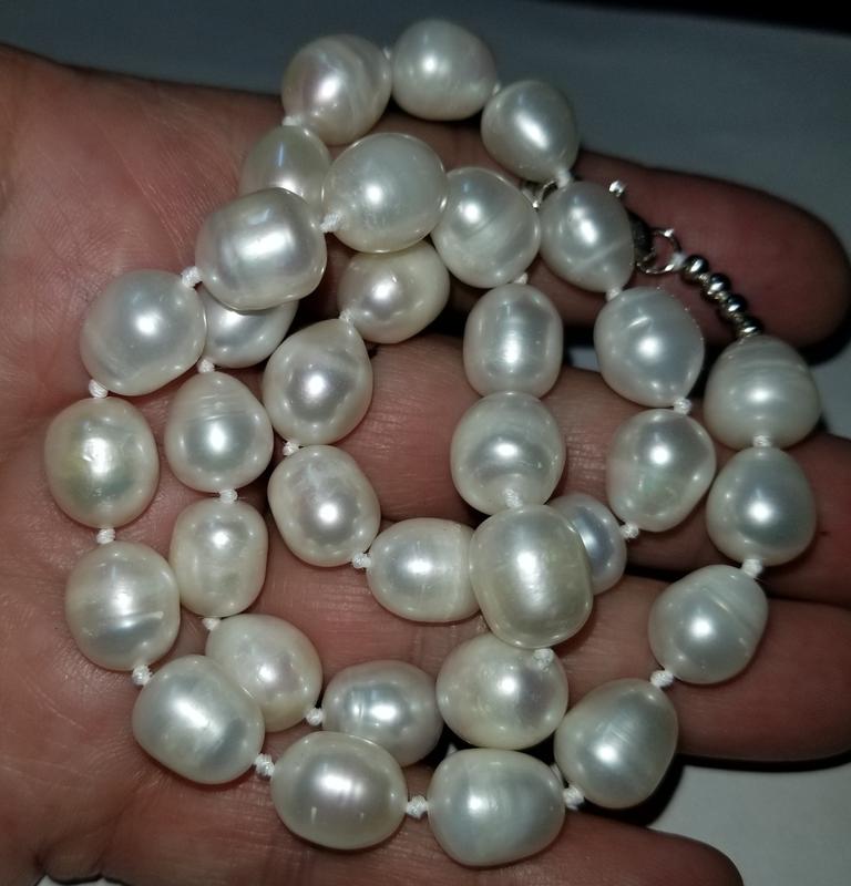 Жемчуг : пресноводный ,культивированный. Индонезия Класс : AA Цвет : белый Тип : ожерелье Диаметр : 13 мм Металл : мельхиор Длина : 45 см Подарочная упаковка : бархатный мешочек Сегодня на мировом рынке основную нишу пресноводного жемчуга занимает культивированный, то есть выращиваемый в реках и озёрах. Огромная доля жемчуга поступает к нам из Китая, ежегодно поставляющего на рынок десятки тонн жемчужин. В мантию моллюска подсаживают кусочек чужой ткани, которая начинает обволакиваться слоями перламутра. Этот способ называют безъядерным, так как в морском жемчуге для этих целей используется специальное ядро-шарик. Именно поэтому речной жемчуг имеет более толстый, чем морской, слой перламутра. Твёрдый перламутр этого жемчуга более матовый и не имеет такого сильного блеска, как морской, но он считается более прочным и стойким к истиранию, что совсем неплохо для украшений. Цвет немного неровный и может чуть-чуть переходить из одного оттенка в другой. Пресноводный жемчуг бывает самых разных цветов, но тона эти немного приглушённые. Встречаются следующие оттенки: белый, кремовый, розово- оранжевый, лиловый, цвет шампанского, бледно-фиолетовый, коричневый.