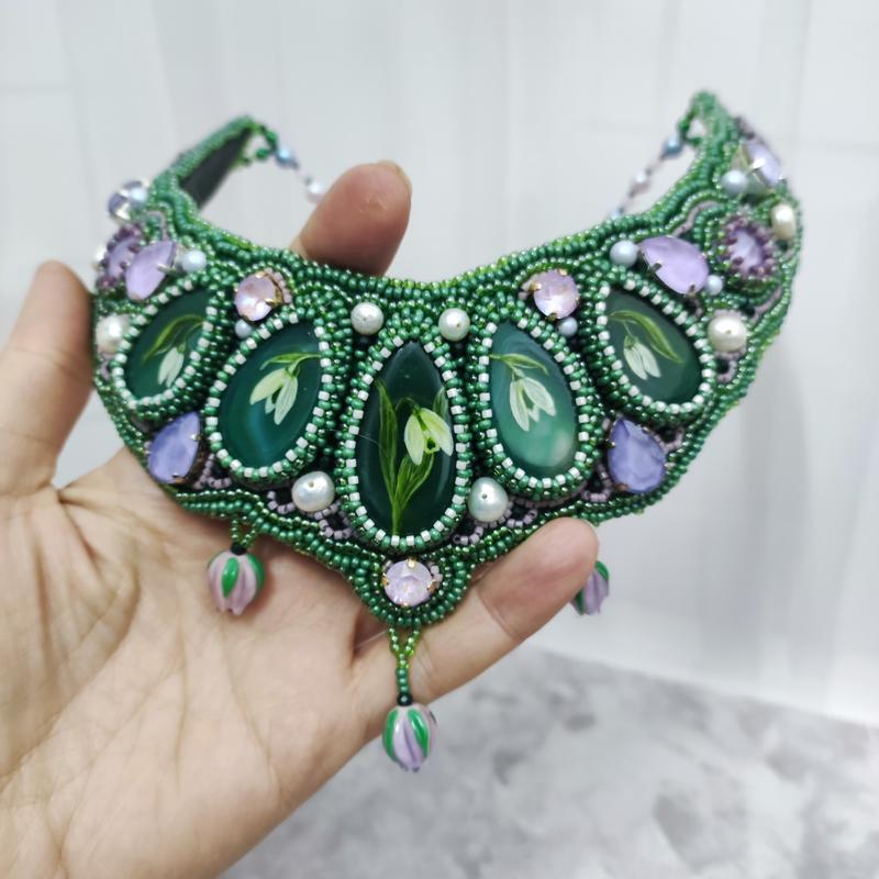 Колье подснежники вышитое украшение, бисерное украшение ручной работы, вышитые украшения с натуральными камнями, украшения ручной работы Колье Подснежники Вышивка бисером, роспись на натуральном камне - агате в технике лаковой миниатюры, чешские стразы и бусины, японский бисер, натуральный жемчуг, кожа. Стеклянные бусины lamp work ручной работы ( бутоны роз). Кропотливая работа, в единственном экземпляре.
