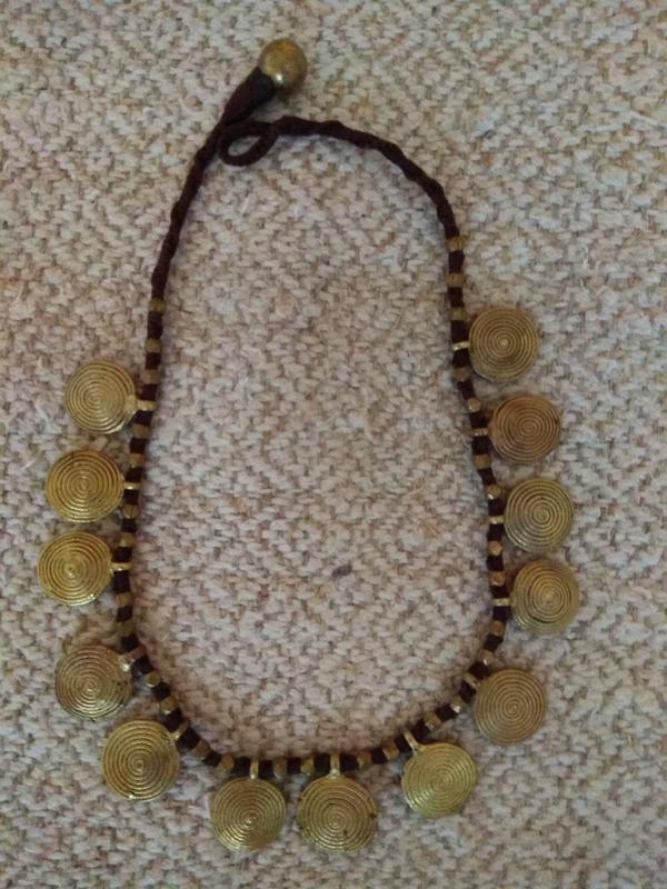 Самобутня, оригінальне прикраса на шию- намисто, у автентичному стилі, hand made, матеріал виробу - латунь. Шнур має щільне плетення, колір коричневий. Довжина 42 см, вага 52г. Малюнки на підвісках пов'язана з давньою символікою чоловічого та жіночого начала.
