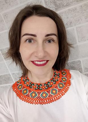 Яскрава гарненька силяночка, намисто українське ручної роботи довжиною ( внутрішня) 36 см, з карабіном і ланцюжком -42 см. Ширина 7,5 см. Може бути з фурнітурою або на зав′язках.