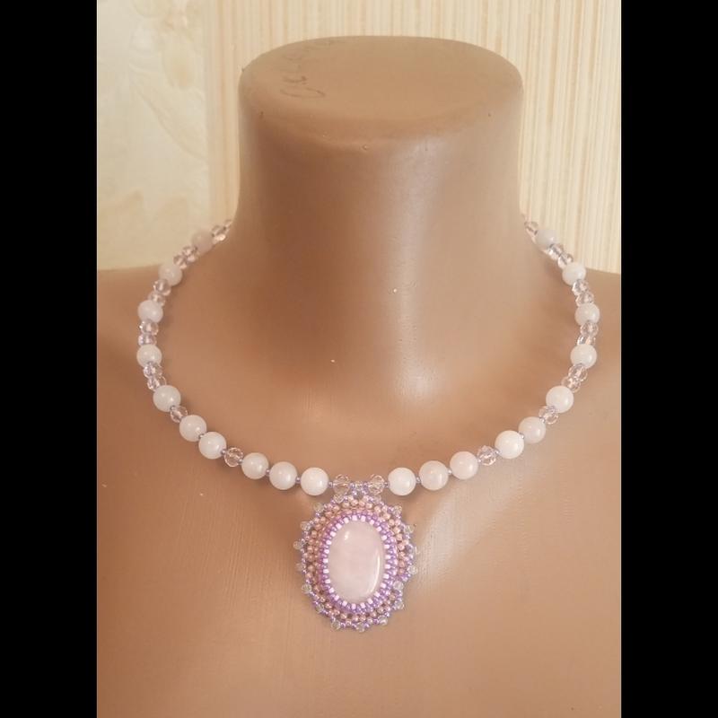 колье виконане з рожевого кварцу та чешського і японського бісеру. довжина 46см. розмір кулону 4/3см
