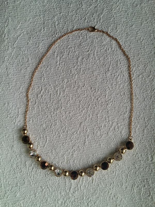 Золотистое колье с коричневыми и белыми кристаллами. Длина 47 см