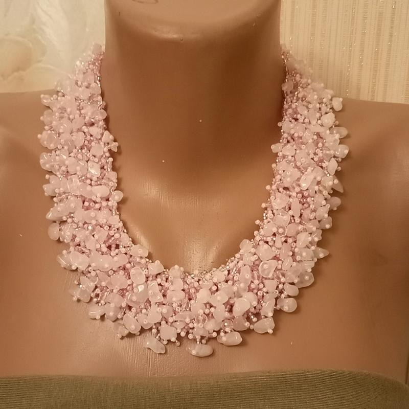 колье из бисера и сколов розового кварца. длина 45см. фурнитура бижутерный сплав.