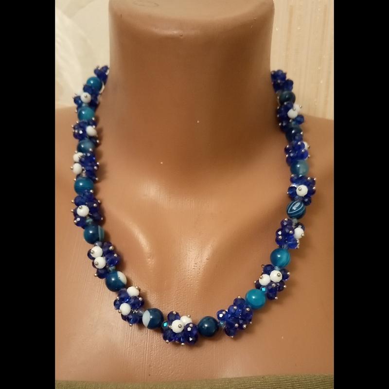 колье из синего агата и чешского храсталя. длина 51см+6см удлиняющая цепочка. фурнитура бижутерный сплав.