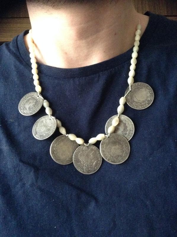 Вага 60.6 грамів. Срібні справжні монети та маленькі баламути перлів старовинні. Крейцери Австрії — 1840 рік,1787, 1803,1783, 1782,1804, 1805. Срібло 900 проби. У мене ціна 1 монети з отвором 1500 гривень.