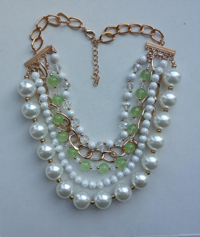 Многорядное каскадное колье бусы, искусственный жемчуг, пластиковые бусины, чешский хрусталь в сочетании с золотистыми цепочками. Легкое и красивое. Современная классика. Подходит как к белой футболке с джинсами, так и к строгому офисному луку. Также в наличии много действительно интересных эксклюзивных предложений – смотрите все мои объявления. Это уже последние поступления – в связи со значительным подорожанием закупочных цен, поэтому если хотите приобрести эту красоту – воспользуйтесь последней возможностью. ВАЖЛИВО: 100% передплата на картку Привата. НАЛОЖКИ / БЕЗПЕЧНОЇ ОПЛАТИ, ОБМІНУ, ПОВЕРНЕННЯ НЕМАЄ. Відправка Укрпоштою можлива під Вашу відповідальність, подробиці у розділі "Про мене"