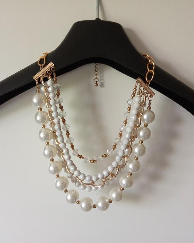 Многорядное каскадное колье бусы, искусственный жемчуг, пластиковые бусины, чешский хрусталь в сочетании с золотистыми цепочками. Легкое и красивое. Современная классика. Подходит как к белой футболке с джинсами, так и к строгому офисному луку. Также в наличии много действительно интересных эксклюзивных предложений – смотрите все мои объявления. Это уже последние поступления – в связи со значительным подорожанием закупочных цен, поэтому если хотите приобрести эту красоту – воспользуйтесь последней возможностью. ВАЖЛИВО: 100% передплата на картку Привата. НАЛОЖКИ / БЕЗПЕЧНОЇ ОПЛАТИ, ОБМІНУ, ПОВЕРНЕННЯ НЕМАЄ. Відправка Укрпоштою можлива під Вашу відповідальність, подробиці у розділі "Про мене"