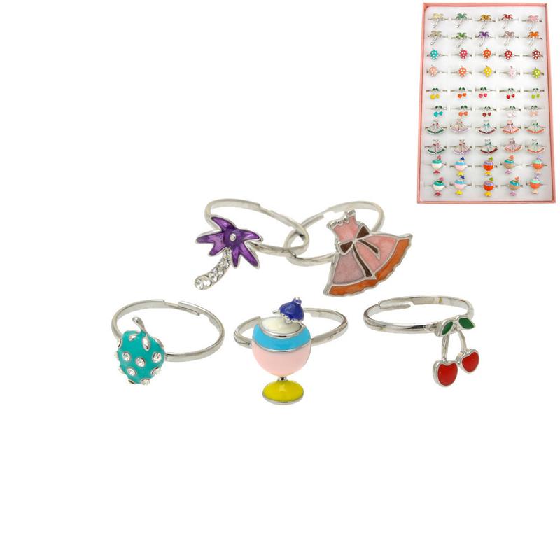 Кольца 5787 Детские кольца — прекрасный аксессуар для любой маленькой модницы, желающей поразить своим внешним видом. Комплект серебристых колечек гарантированно приведет в восторг любую девочку. Набор включает 50 различных изделий, что дает возможность свободно экспериментировать со стилем, подбирая аксессуары под настроение. Также часть украшений можно подарить подружкам. Атрибуты обладают простым, но привлекательным и запоминающимся дизайном. Декоративные элементы выполнены в виде ягодок, платьица или бокала с коктейлем. Фигурки надежно прикреплены к основанию, что исключает риск случайно оторвать их и потерять. Основание легко регулируется под размеры пальчиков — это избавляет от многих проблем, связанных с использованием таких украшений. Аксессуары созданы из качественных материалов, которые не причиняют неудобств при использовании благодаря небольшому весу. На детских руках кольца смотрятся красиво и стильно. При должной осторожности, атрибуты послужат своей владелице много лет, не теряя красоты. Детям, младше 3 лет, не стоит давать изделия для их безопасности. Прямоугольная коробка компактная и не займет много места. Колечки станут отличным подарком для любой девочки. - Количество в упаковке, шт - 50. - Материал - Металл, стекло. - Цвет - Разноцветный. - Страна производитель - Китай.
