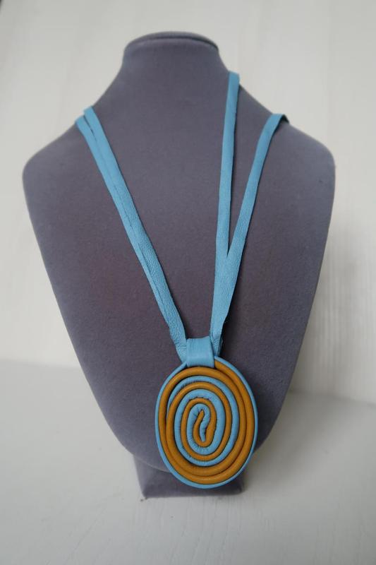 Прикраса на шию шкіряна жовто-блакитна, може стати стильним доповнюючим аксесуаром вашого гардеропу або ексклюзивним подарунком з Украіни. Можливе виготовлення бажаного розміру та кольору, також можливо замовити необхідну довжину шнурка.Позиція на фото зафіксована за розмірами :кулон 7 см довжина 4,5 см ширина , довжина шнурка 82 см зав'язуэться(можливе виконання на біжутерну чи срібну застібку, уточнуйте у майстра)