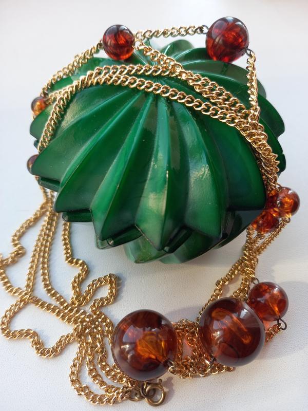 Ожерелье на цепочке красивого золотого тона, круглые бусины ризного размира - iмitация янтаря, пластик. Длинное ожерелье в дви нити. Позолота i бусины в iдельном состоянии. Застожка огнеупорная.