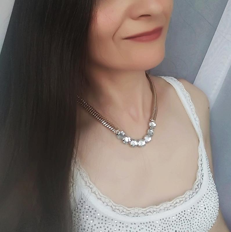 Нежное фабричное колье. Изготовлено с кристальных страз и золотистой цепочки, очень легкое и удобное. Идеально дополнит любой образ. С помощью цепочки и карабинчика можно регулировать размер.