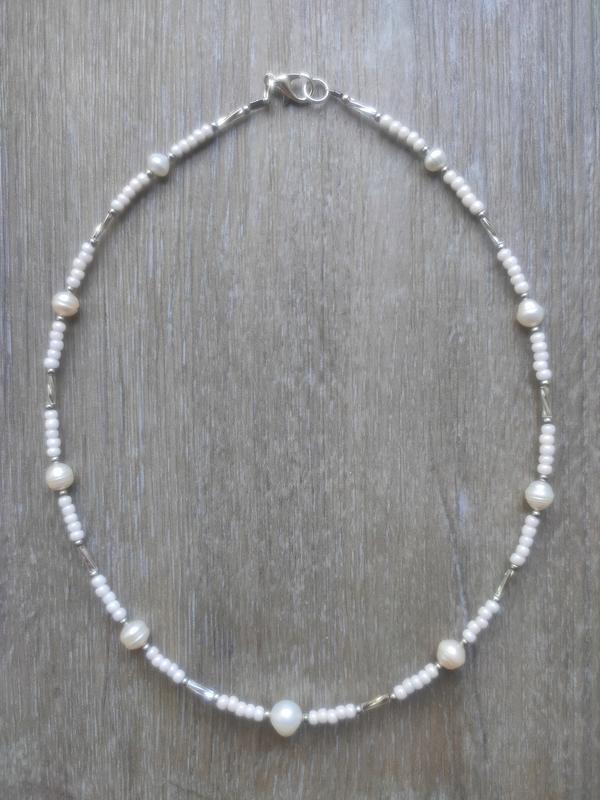 Продам изящный, утонченный чокер из бусин натурального речного жемчуга и чешского бисера в перламутровом оттенке. Длина чокера – 39 см, нанизана на ювелирный тросик, застежка – карабин. Размер бусин жемчуга – 5×7 мм. При необходимости могу поставить удлинительную цепочку или изменить размер самого украшения. По всем вопросам пишите в личные сообщения – отвечу.