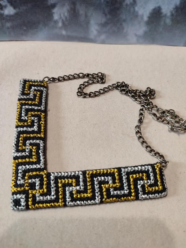 Кольє підвіска вишите чорними, срібними та золотими нитками. Ручна робота української майстрині. загальна довжина 44 см, стрічка 8*11 см.