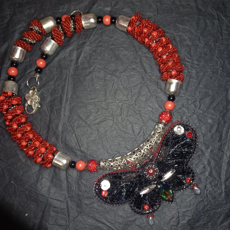 Матеріали: намистини Swarovski, чеські намистини, японський і чеський бісер, шатони, стразовий ланцюжок, виворот: натуральна шкіра. Розмір: кулона: 11х5, дліна намиста: близько 50 см