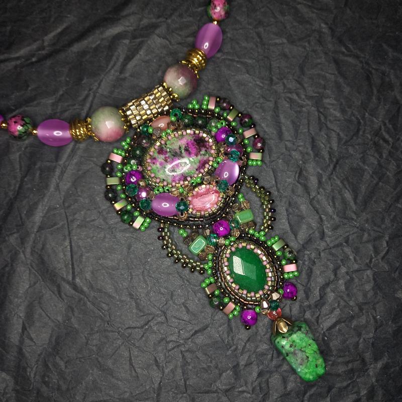 Материалы: циозит, нефрит, бусины Swarovski, чешские бусины, японский и чешский бисер, шатоны, изнанка: натуральная кожа. Размер: кулона: 10х6, длина ожерелья: около 50 см
