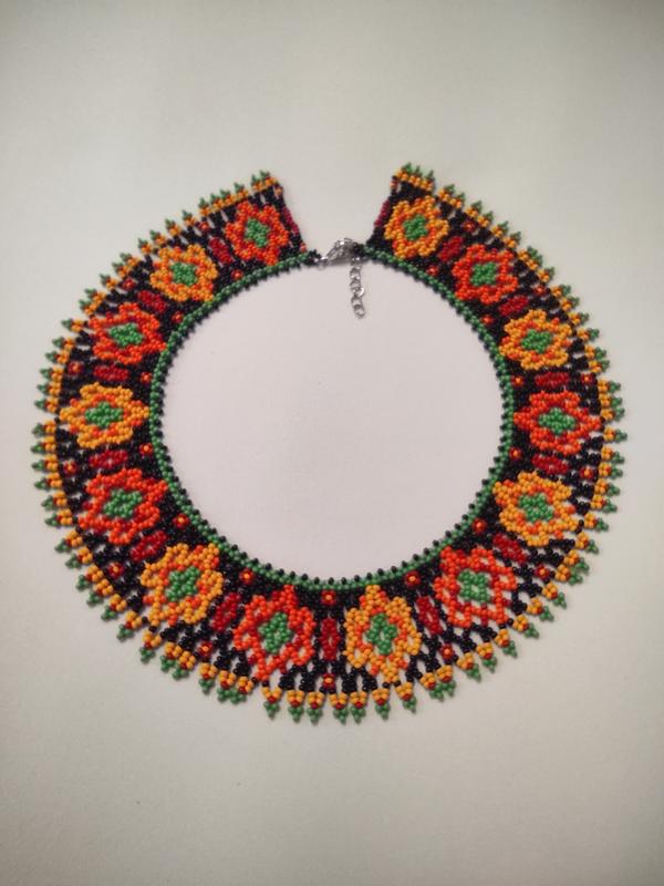 Выполнена из чешского бисера длиной 40см,+5 см, цепочка; ширина 4см.