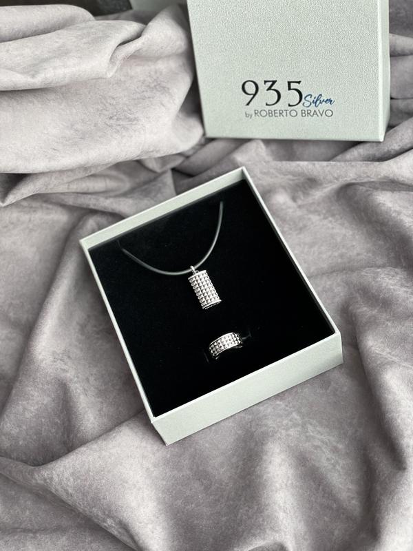 Набор Roberto Bravo: кольцо + каучук с подвеской, универсальный дуэт Кольцо Roberto Bravo: Элегантное серебряное с аббревиатурой RB, размер 19. Вес — 10,3 г, ширина — 10 мм. Лаконичное, стильное, с идеальными пропорциями, подходит как самостоятельное украшение или как часть комплекта. Каучук с подвеской: Стильный, современный вариант для тех, кто любит минимализм с характером. Подвес — 12,5 г, размер 3,5 × 1,5 см. Каучуковый шнур длиной 45 см с фирменным брендовым именником. Носить можно вместе или раздельно, комплект универсален, смотрится современно и уверенно. Идеальный подарок или дополнение к образу в стиле modern luxury. Оба изделия в идеальном состоянии, идут в родных коробках Roberto Bravo. О бренде: Roberto Bravo — международный бренд с уникальной эстетикой: сочетание скульптурных форм, дорогих материалов и смелого дизайна. Украшения марки броские и заметные, стильные и всегда узнаваемые.