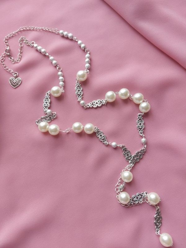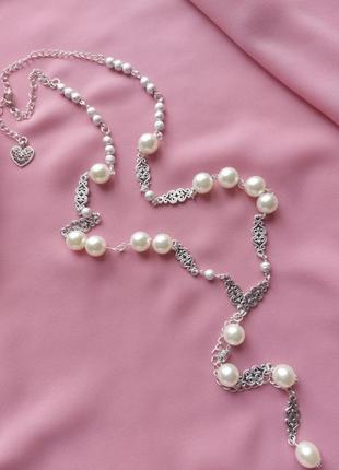 Длинное ожерелье цепочка с бусинами, искусственный жемчуг и металл. длина 79 см подвеска 12 см.