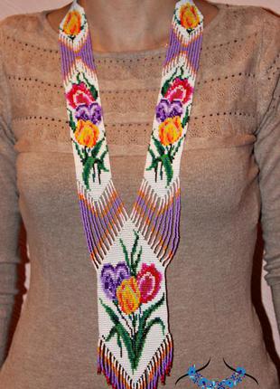 Яскравий весняний гердан. У роботі використано 16 кольорів бісеру. Довжина - 60 см.